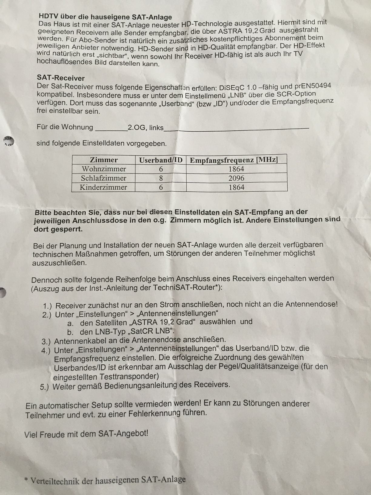 Bitte keine Geheimnisse .... welche ID gepaart mit welcher Frequenz wurden zugeteilt ?zimmermann1285 hat geschrieben:Ich bekam vom Vermieter 2 Userband ID´s die ich bei der Installation des Receivers eintragen muss!