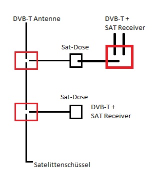 Die beiden anderen roten Kästen brauch man nicht, die Antennendose hat bereits 3 Ausgänge (1x für SAT, 1x für terrestrische TV und 1x für Radio was nur zu nutzen wäre wenn man auch noch UKW mit einspeisen würde).