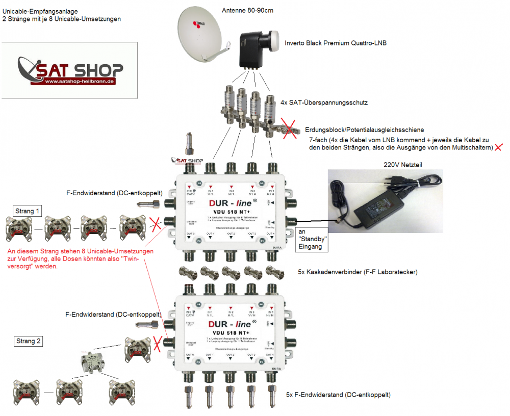 Unicable LNB Aufbau 4 Dosen an 2 Strängen/Kabeln