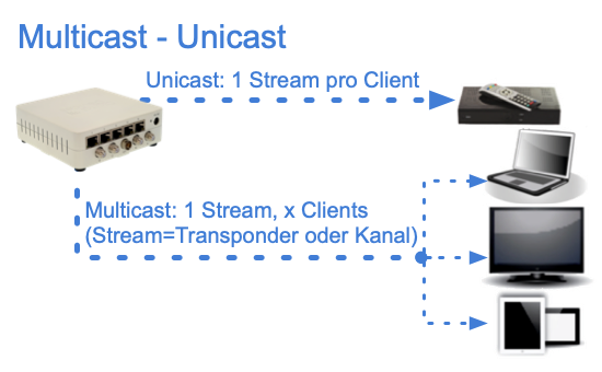 Multicast erlaubt das permanente Streamen eines Transponders oder einzelner Kanäle in ein Netzwerk, so dass beliebig viele Clients gleichzeitig darauf zugreifen können. Der Sender (Octopus NET) muss das Signal nur einmal bereitstellen, was die Netzwerkbelastung verringert. Dem gegenüber liegt bei Multicast eine permanente Netzwerkauslastung vor.
