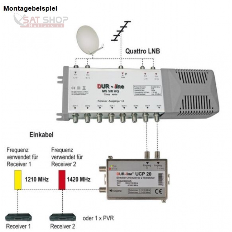 Mit dem neuen DUR-line ® UCP 20 SCR-Umsetzer können über 1 Leitung 2 Receiver von einem oder zwei Satelliten (maximal 8 Satelliten-ZF-Ebenen) gleichzeitig versorgt werden. Zusätzlich kann noch terrestrisch bzw. DVB-T und UKW mit übertragen werden.