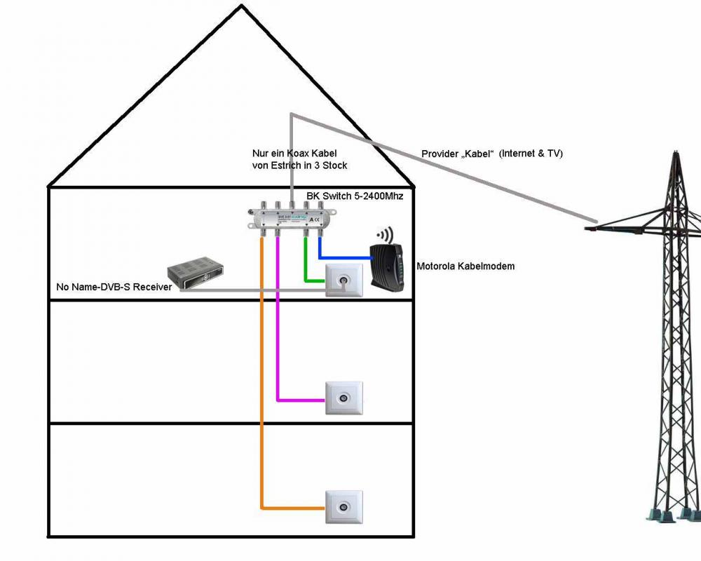 Mein Provider (Haus steht im Ausland) hat von seinem Zuleitungsmast ein Koax Kabel in den Estrich geführt. Von dort splitte ich es über ein eingemörteltes Koax Kabel per gewöhnlichen 5-2400Mhz Splitter an 3 gewöhnliche Steckdosen mit F-Anschlüssen und an ein Kabelmodem. Von den normalen F-Stecker Steckdosen greife ich das Signal ab auf einen no name DVB-S Receiver und habe TV sowohl Internet.