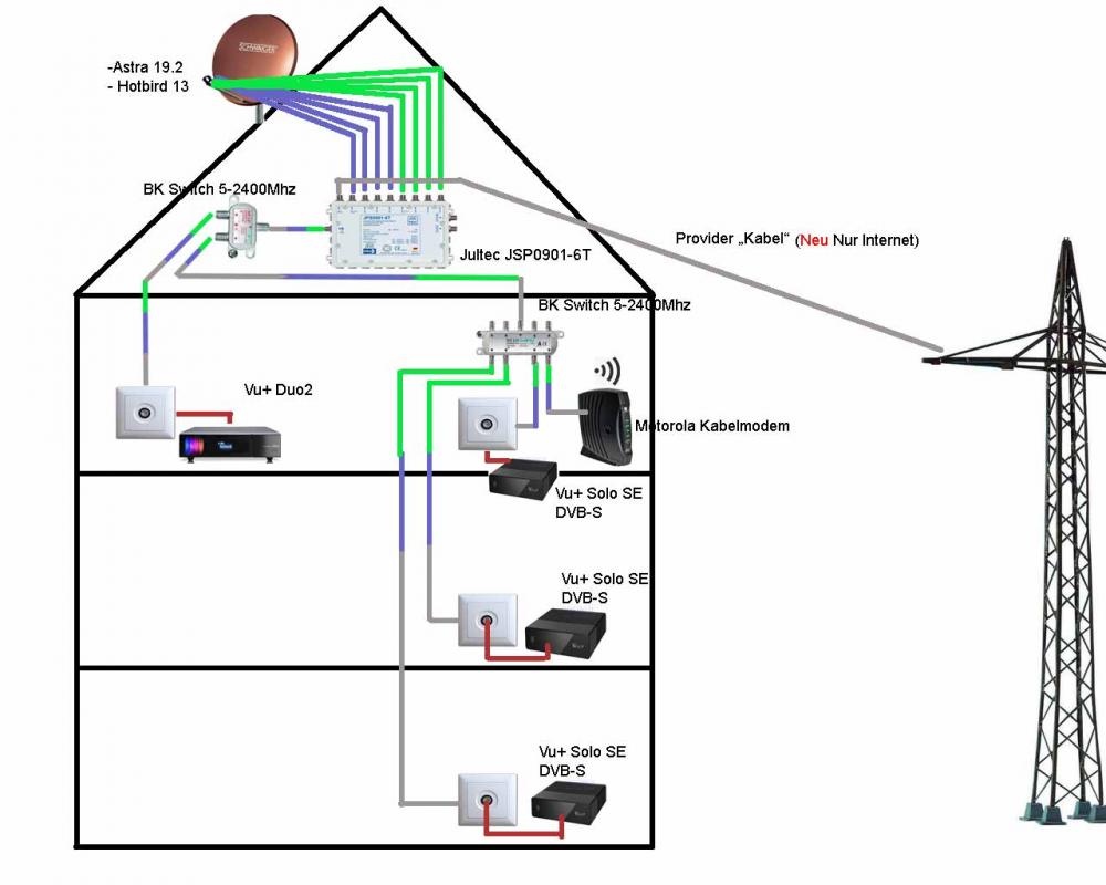 Ob Kabelfernsehen oder Internet/Telefon + Kabelfernsehen ist genau das gleiche ! Das kommt ja alles über ein Kabel "von draußen" rein, befindet sich einfach nur auf einer anderen Frequenz "im" Kabel. D.h. das wenn sie jetzt das Kabel "von außen" anschließen da auch Kabel-Fernsehen + Kabel-Radio gleich mit drauf ist dann. Wenn sie das abmelden möchten, also kein Kabelfernsehen mehr empfangen möchten und sich die monatlichen Bezugskosten dafür sparen möchten, dann müssen sie dafür sorgen das der TV-/Radio-Anteil auf dem Kabel raus gefiltert wird (da sonst alles durch kommt incl. Kabelfernsehen und man dann auch dafür bezahlen muss natürlich !) .... das geht einfachst über einen Sperrfilter ! Wird in dem bereits verlinkten Beitrag unter Kabel Umstellung auf Sat-Unicable. Konstellation korrekt? schon erklärt und auch z.B. im Beitrag Umrüstung EFH von Kabel auf Sat (dort recht weit unten - aus dem Beitrag ist auch das Bild mit dem "Modem-Adapter", also diese Erklärung genau in dem Beitrag auch zu finden).susa hat geschrieben:6. Würde es gerne alleine über den Jultec lösen. FALLS, ich aber ein mal in der Zukunft DVB-C (nebst dem aktuellen Kabel welches ich Internet drüber beziehe) mit einspeisen möchte, wäre das in irgend einer Form möglich? Vielleicht mit der von Ihnen gezeigten Einschleusweiche aber halt beide Kabel in den CATV Eingang?