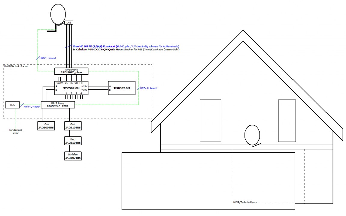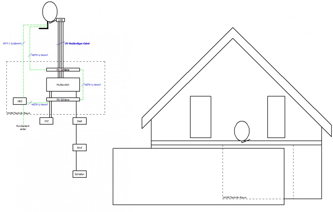 WENN die Antenne aber im nicht geschützten Bereich stehen wird dann wäre hier sicher noch ein "Mast-naher Potentialausgleich" notwendig, der fehlt in ihrer Zeichnung (der kommt dorthin wo die Kabel vom Quattro-LNB kommend das erste Mal ins Haus eintreten - falls dort nicht genau dann auch schon der komplette Multischalter-Aufbau direkt hin kommt, dann würde der PA rund um den Multischalter wie sie es eingezeichnet haben ausreichen).