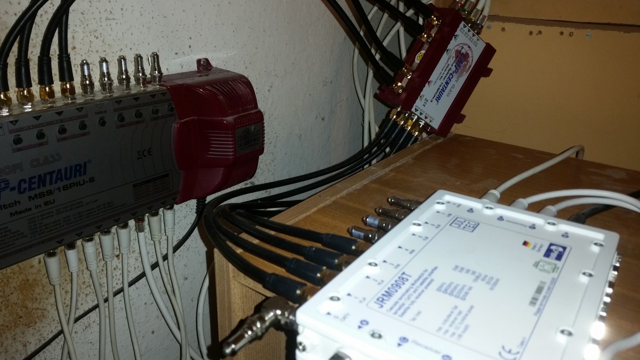 Kabel vom LNC zur Verteilung lose verlegt und natürlich nicht UV-beständig. Ein EMP-Centauri-Verteiler splittet das Astra-Signal auf zwei Multischalter, einen EMP-Centauri 9/16 und, da der vorgesehene Schwaiger 9/8 nach 10 Jahren Auszeit nicht mehr zur Mitarbeit bereit war, einen Jultec 9/8. Auf der Suche nach einem hochwertigen Multischalter bin ich dabei dann zufällig auf diesen Shop samt tollen Forum gestoßen.