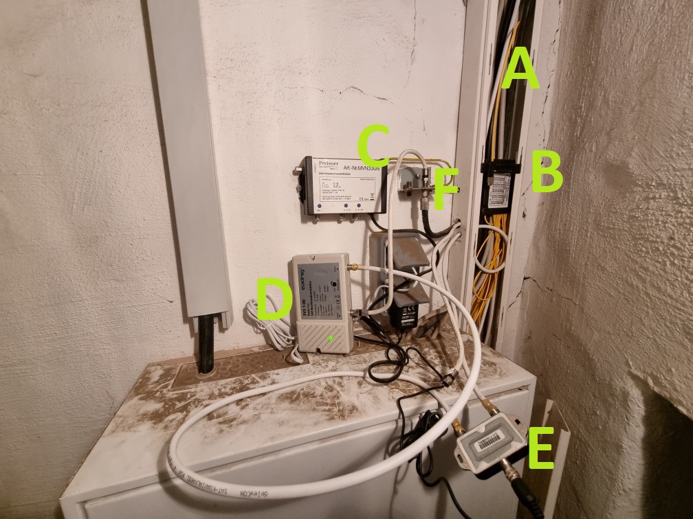 Zwei Gebäude - Gebäude A ist ein Reihenhauskomplex mit 8 Einheiten. Gebäude B ist ein Nebengebäude mit Garagen. Auf Gebäude B (Nebengebäude) war urspünglich eine Satellitenanlage installiert aus dessen LNB ein Satellitenkabel und wohl ein Glasfaserkabel (hatte der Elektriker so noch nie gesehen) unterirdisch in die Reihenhäuser (Gebäude A) geleitet wurde.