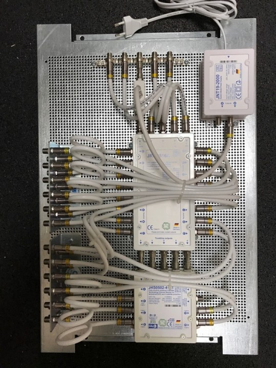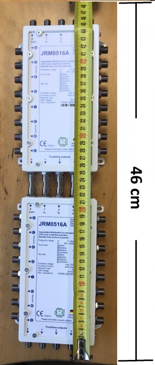 Auch davon habe ich mal ein Bild gemacht, 2x JRM0516A mit den Jultec JFQ Kaskadenverbindern verbunden .... das sind schon 46cm ! Und dann müssen da noch die Erdungsblöcke mit rein, die Verkabelung etc ! Und auch immer dran denken, auf der Lochblechplatte benötigt man nach oben/unten hin Platz zum Aussenrand vom Gehäuse, den das ist ja nicht durchgehend "offen". Was ich damit meine kommt jetzt auf ihren ersten Beitrag hier sogar zurück an den ich mich genau aus dem Grund auch noch erinnern kann (nicht nur wegen dem "Voodoo-Kabel"[Jan] hat geschrieben:Die Multischalter sollten wohl gerade noch so reinpassen (zwei nebeneinander und übereinander).