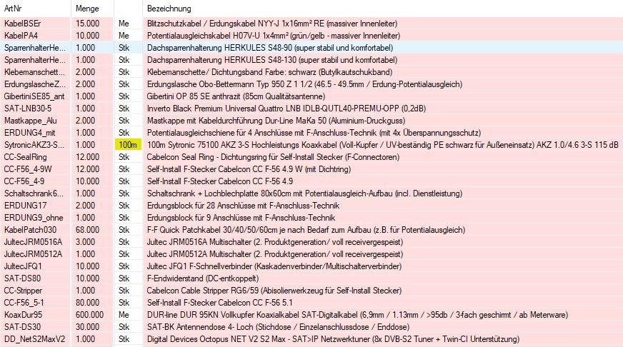 Alles andere aus ihrer Liste, zzgl. den notwendigen Erdungsblöcken + Schaltschrank, gehört dann zum Aufbau vom Multischalter-Verteilsystem .....