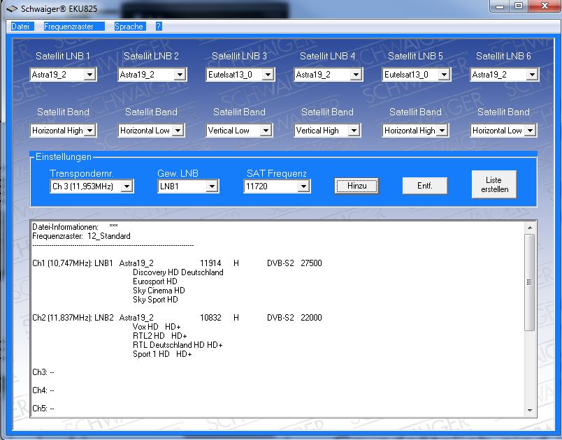 Update 1 - Schwaiger EKU825 Update Channellists 2013 für Astra 19 Grad Ost + Astra 19 Grad Ost + Hotbird 13 Grad Ost + Thor 1 Grad West + Türksat 42 Grad Ost Neue Transponderlisten/Senderlisten 2013 für die direkte Auswahl im Config-Tool