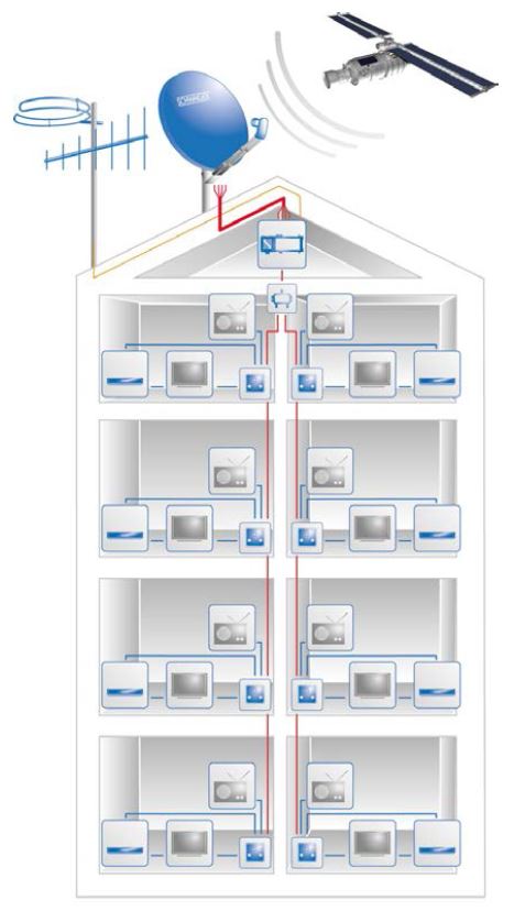 - Als Alternative zu Kabelanschlüssen, alten analogen Einkabellösungen oder Antennenanlagen in Baumstruktur (Reihenschaltung)