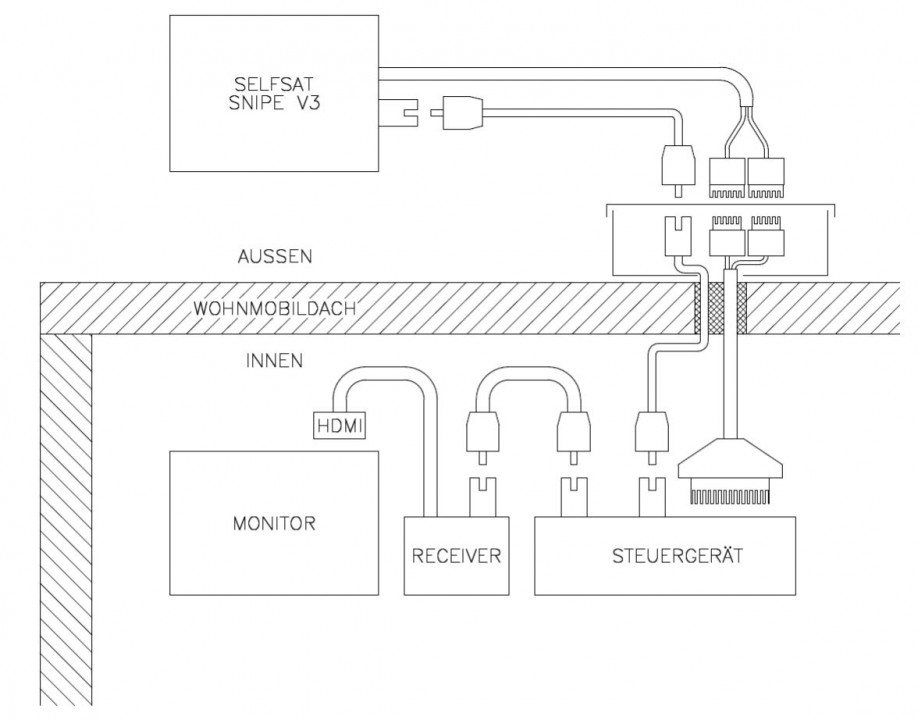 Ich werde durch das WoMo-Dach ein ausreichend grosses Loch bohren, durch das ich das Steuerkabel (samt Stecker) und das Antennenkabel nach aussen führe. Dieses Loch wird mit Dichtmasse verfüllt. Über diesem Loch platziere ich eine wasserdichte Abzweigdose, in der die Stecker bei Nichtgebrauch witterungsgeschützt mehr oder weniger lose rumliegen. Wenn ich die Antenne in Betrieb nehme, öffne ich die Abzweigdose und stecke die Kabel zusammen.