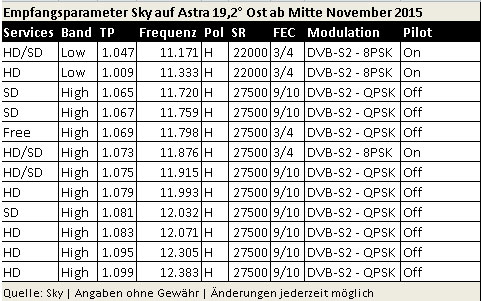 In der Nacht vom 17. auf den 18. November 2015 wird SKY alle Transponder auf die Modulation DVB-S2 umstellen und sämtliche SD-Programme in MPEG-4 ausstrahlen.