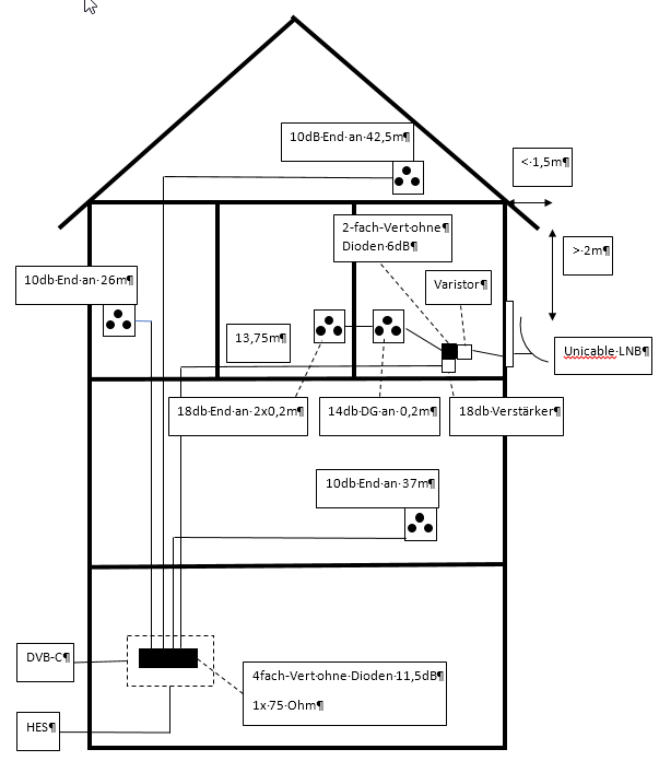 Nun kommt es leider durch den Weg in den Keller und von dort in die jeweiligen Räume zu größeren Kabellängen (Einzelabschnitte zusammengerechnet bis 42m). Um die Dämpfung an die nahe gelegenen Dosen in den Kinderzimmern anzupassen, würde ich nach dem 2-fach Verteiler im OG noch einen Verstärker setzen. Ich habe auch die Befürchtung, dass meine teure Ramsch-Antenne einen zu geringen Ausgangspegel hat, selbst wenn ich bessere Kabel einziehe. Hat den jemand mal gemessen? Hier im Forum habe ich keinen Wert gefunden. Selfsat selbst schreibt nur, dass man „weit über 30m, also so ab 45m“ Probleme bekommen kann.