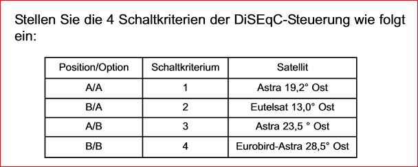 Mein Problem ist, dass ich nicht weiß, wie ich dem Receiver beibringen soll, dass er 4 Satelliten-Positionen abfragen muss. Er findet immer nur Astra 19,2°. Bei LNB 2, 3 und 4 meldet er: kein Satellit. Muss ich am Receiver statt DiSEqC nun eventuell Einkabel einstellen? Ich habe schon alle möglichen Kombinationen durchprobiert, aber vielleicht haben Sie noch einen Tipp für mich?