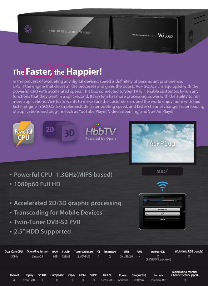Hauptmerkmal ist der 1300 MHz starke Prozessor der VU+ Solo². Erleben Sie HighDefinition TV mit Ihrem VU+ Solo².