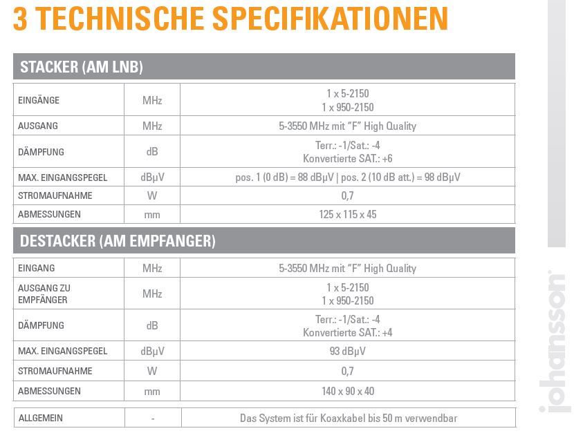 WICHTIGER HINWEIS: zwischen "Stacker" und "Destacker" sollte/"darf" KEINE Antennendose oder andere Verteilerkomponenten/Verstärker verbaut sein da diese den vom System verwendeten Frequenzbereich (das Stacker-Destacker System arbeitet im Frequenzberich bis zu 3550MHz) nicht voll abdecken ! Ausnahme der spezielle Inline-Verstärker von Global-Invacom der im Frequenzbereich entsprechend arbeitet.