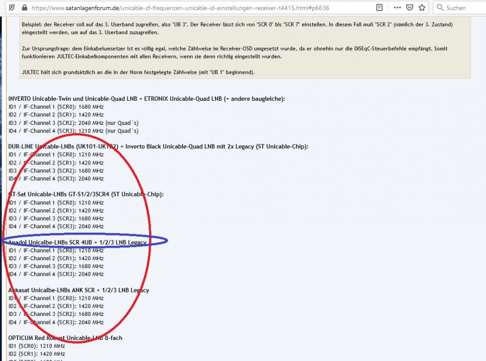 Das kann man mauell in der OpenATV-Software (Antennenmenu) einstellen oder man sucht sich einfach ein vergleichbares Gerät mit den 100% passenden Frequenzen passende zu den IDs aus. Unter Unicable-ZF-Frequenzen + Unicable-ID Einstellungen Receiver findet man hier im Forum eine Zusammenstellung/Übersicht dazu, und gleich am Anfang werde ich da fündig.Verwendete Unicable-Frequenzen und Unicable-IDs: