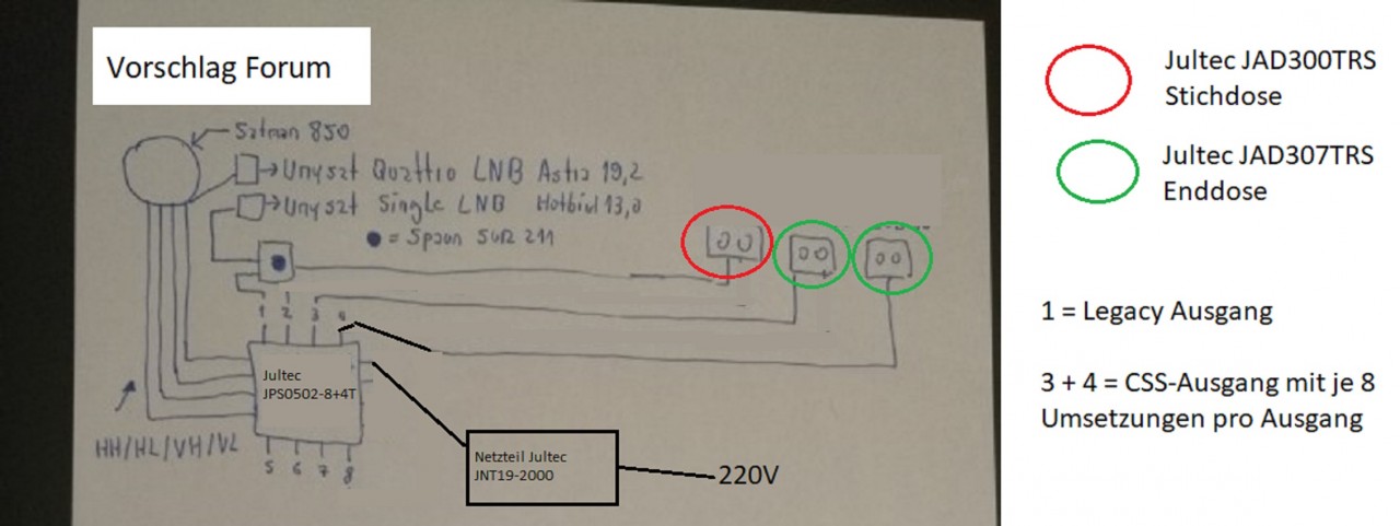 1.) Kann ich den DUR DPC-32 direkt am Technisat Multiswitch anschließen und dann mit einem Kabel (Ausgang DPC 32) zu welchen Jultec Dosen fahren ? JAD307TRS als Enddose ?