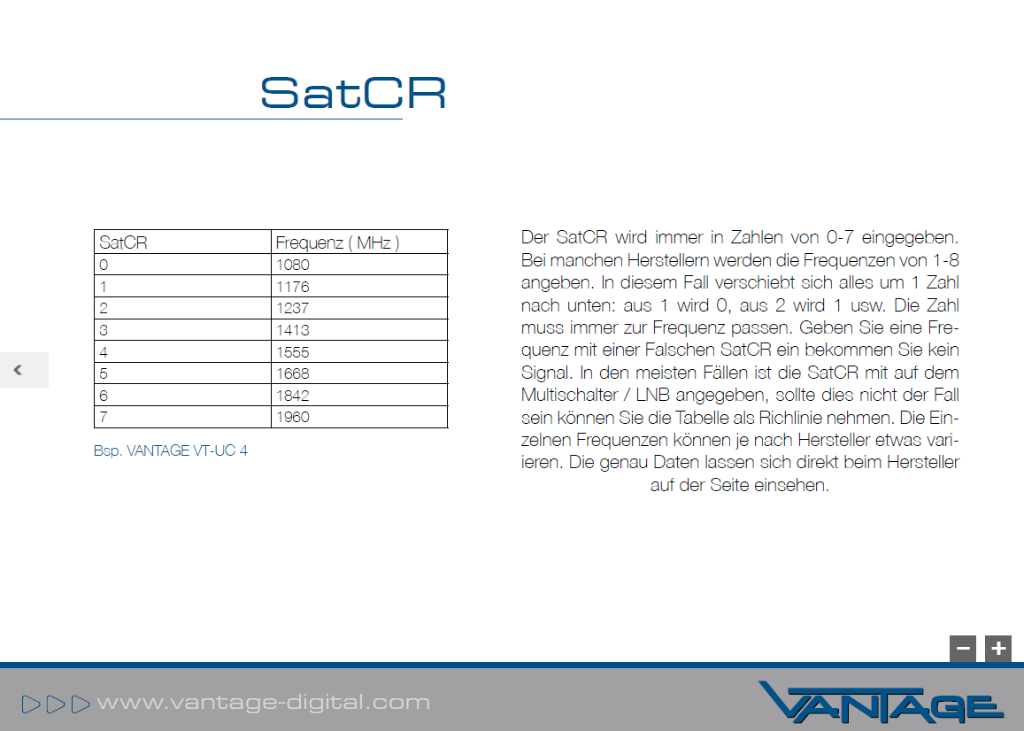 ACHTUNG !!!! Kann sein das Vantage das auch bei den neuen Geräten so macht wie sie es selbst auf ihrer Homepage noch schreiben bzw. geschrieben hatten => Zählung der SCR bei "0" anfangen (kann man ja im Receiver selbst mal auch nach schauen, beginnt die Zählung der ID/SCR dort mit "0" oder "1" ??) ... dann die Zählung bei "0" beginnt wäre die richtige Einstellung hier für "Einkabel" die "3" !!!Lupusbux hat geschrieben:Folgende Einstellung habe ich am Vantage VT-50 HD+ Receiver eingestellt: LNB Typ : Universal; Niederfrequenz 09750; Hochfrequenz 10600; 22 Khz Auto; LNB Spannung Ein; Einkabel 4; Mittelfrequenz 1525; Anschluss A;.
