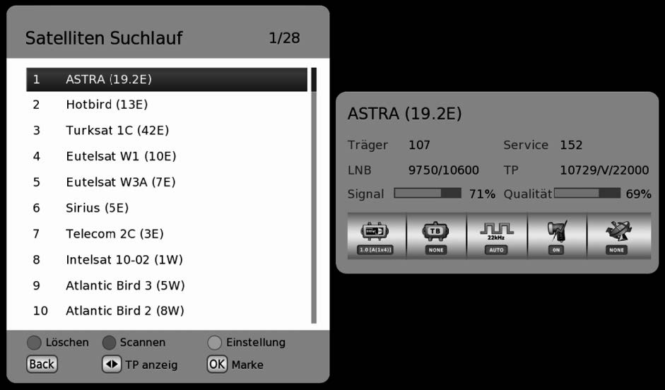 Wichtig: Der ZF-Port muss auf "A" stehen, mit A ist der 1. Satellit, hier also Astra19 gemeint, B ist der 2. Satellit.ZF-Kanal