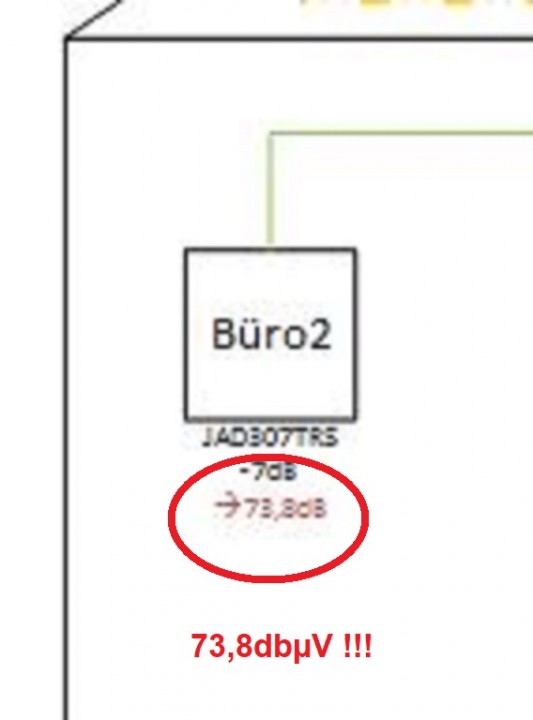 Weiterhin: den 2. CSS-Ausgang haben sie ins Büro2 gezeichnet .. dort dann auch eine JAD307TRS (auch wenn sie diesen Ausgang als Legacy nutzen möchten, ist ja dank Jultec Legacy-/CSS-Kombifunktion möglich). Die passt dann auch für Legacy dort, später aber auf jeden Fall für die Nutzung von Unicable/CSS. Passt dann auch von den Pegeln dort ... 83dBµV am CSS-Ausgang dort (im CSS-Modus), abzüglich 2.2db Kabelweg abzüglich 7db Anschlussdämpfung der Antennendose ? 73,8dbµV (passt noch). Im Legacy-Modus für diesen Ausgang wären es dann 2db weniger ... also OK.