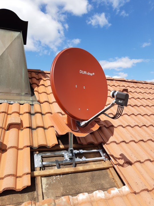 Begonnen hab ich auf dem Dach wo ich den Dachsparrenhalter (Hercules) montiert habe, was super einfach ging. Nachdem ich mir die Mühe gemacht hatte das Erdungskabel 1x16mm^2 vom Haupterder im Keller bis aufs dach zu ziehen um den dort am Dachsparrenhalter anzuschliesen konnte ich mit dem Spiegel weiter machen. Hier hab ich mir um möglichst wenig auf dem Dach machen zu müssen den LNB und die Kabel bereits auf dem Boden vormontiert.