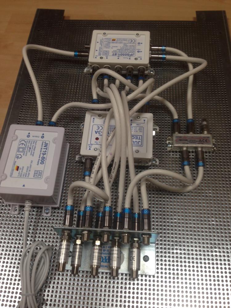 Hinweis: sie haben eine terrestrische Antenne da mit eingezeichnet (UKW oder DVB-T ?). Da muss auf jeden Fall ein selektiver Verstärker zwischen Antenne und Jultec JPS0501-8 (dessen terrestrischem Eingang), sonst kommt da unten nichts mehr an... alleine die Durchgangsdämpfung vom JPS ist 15-18db für die Terrestrik.