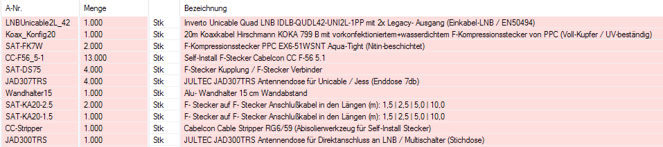 Ich habe als Beispiel, unter Annahme von 2 Satelliten, den Jultec JPS901-6T eingesetzt, also 2 Satelliten, 1 Kabel und 6 Anschlüsse für Unicable.