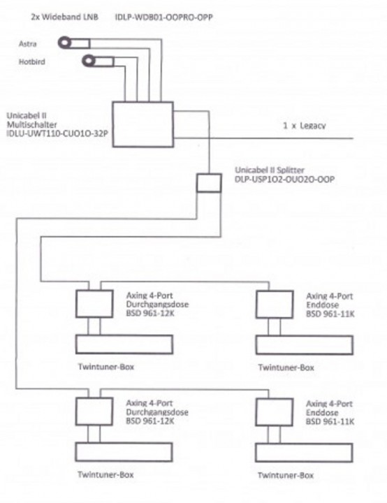 An diesem Aufbau ändert sich doch dann gar nichts wenn sie das was neu kommt alles auch neu verkabeln und einen anderen Ausgang am Multischalter dann haben ... das wird dann einfach "erweitert" über den 2. Ausgang vom JPS0502-8 Schalter ....slim5 hat geschrieben:Die Weiterverwendung der Dosen aus Variante 1 für den späteren Umbau wäre wünschenswert. Aber in erster Priorität muss die Variant 1 funktionsfähig sein.