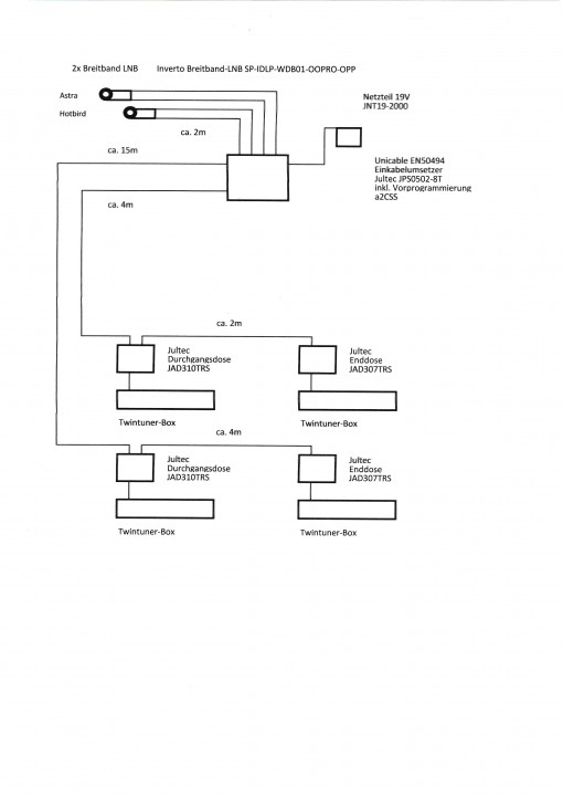 2. falscher Multischalter in der Auswahl, aus Erfahrung und sehr vielen Beiträgen hier im Forum und auch in vielen vielen anderen Beiträgen exterrn sind diese dCSS-Multischalter gerade im Breitband-Versorgungs-Betrieb mehr störanfällig und sehr oft funktioniert so ein Aufbau einfach nicht => Suchlink mit vielen Beiträgen die das erklären ... geballt zusammengefasst mit auch der Erkärung wie es dann richtig geht finden sie das unter z.B. Unicable Anlage / Hausumbau + Jultec JPS1708-8M - 6 Satelliten per Breitband-LNB Versorgung (a²CSS Technologie)