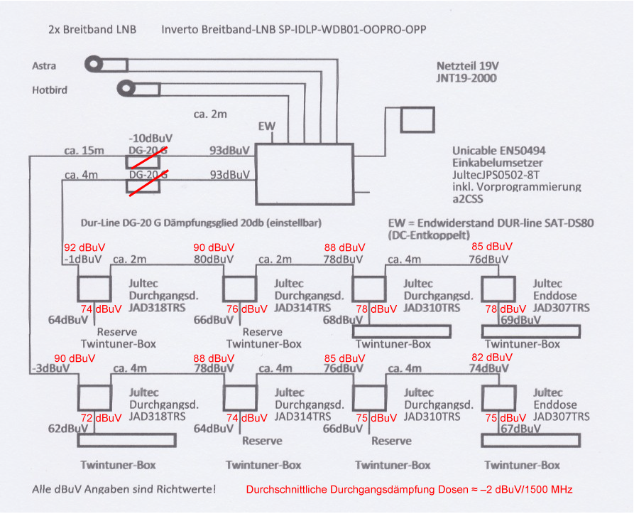 Ja, man reguliert den Pegel über die Dämpfungswerte der Dosen. Je länger das Kabel und entsprechend höher der Dämpfungwert ist, korrigiert man das mit den Dosen aus. so wie in Ihrem Schema. Je weiter die Dose vom Switch entfernt ist, um so tiefer wird deren Dämpfungswert.slim5 hat geschrieben:an Stelle von Dämpfungsgliedern sollen besser Dosen mit höherer Dämfung gewählt werden