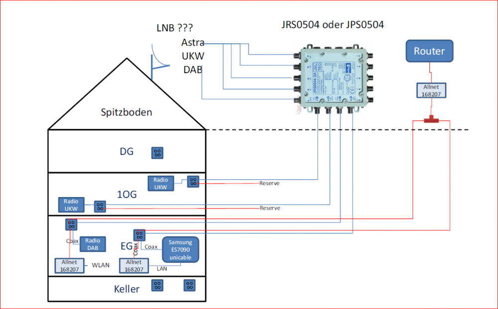 Habe ich eingezeichnet, mit der Berücksichtigung von dem was ich oben schon erklärt habe ! Warum aber 6-fach Verteiler wenn nur 3 oder 4 Stränge überhaupt versorgt werden müssen ? Nur unnötige Dämpfung da ein großerer Verteiler mit Auskoppeldämpfung hat wie ein kleiner.... den einen Anschluss oben im OG habe ich jetzt mal an den Legacy-Ausgang vom Multischalter gehängt, so gewinnen wir auch einen Anschluss und dort könnte man dann einen normalen SAT-Receiver der nicht unicable-tauglich sein müsste auch noch betreiben (neben dem parallel auf dem Kabel anliegenden UKW- und DAB-Signal). Die Dosen haben ja die entsprechenden Ausgänge für SAT + Radio das man 2 Geräte (Receiver für TV + UKW-/DAB-Radio) gleichzeitig daran anschließen könnte.Jochen G hat geschrieben:Muß ich den 6-Fach Verteiler vor den Jultec setzen oder ist es in Ordnung, wenn ich ihn erst danach anschliesse? (hierdurch gewinne ich einen Ausgang)