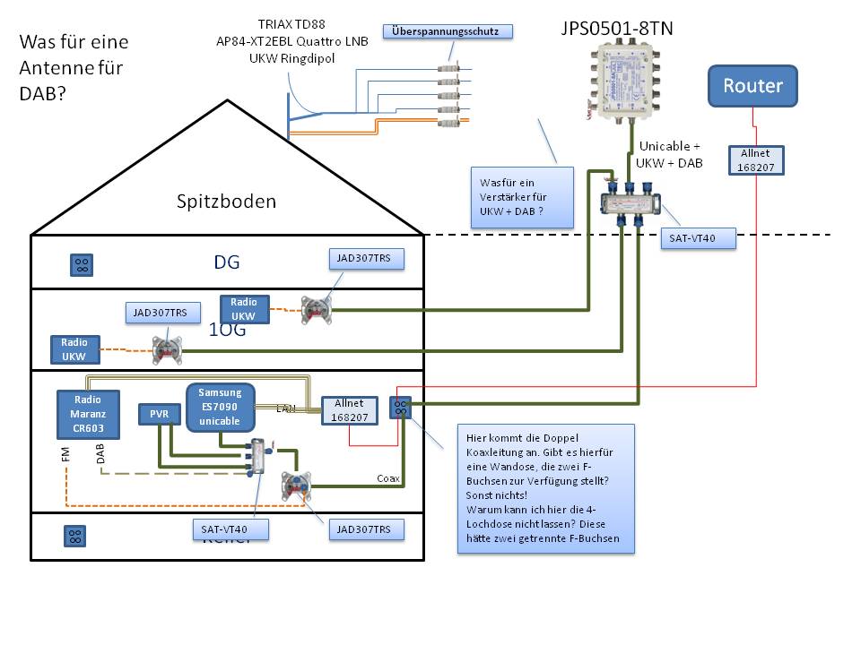 Alle einskizzierten Antennendosen sind mit einem Doppel Coax Kabel direkt in den Spitzboden verkabelt worden.