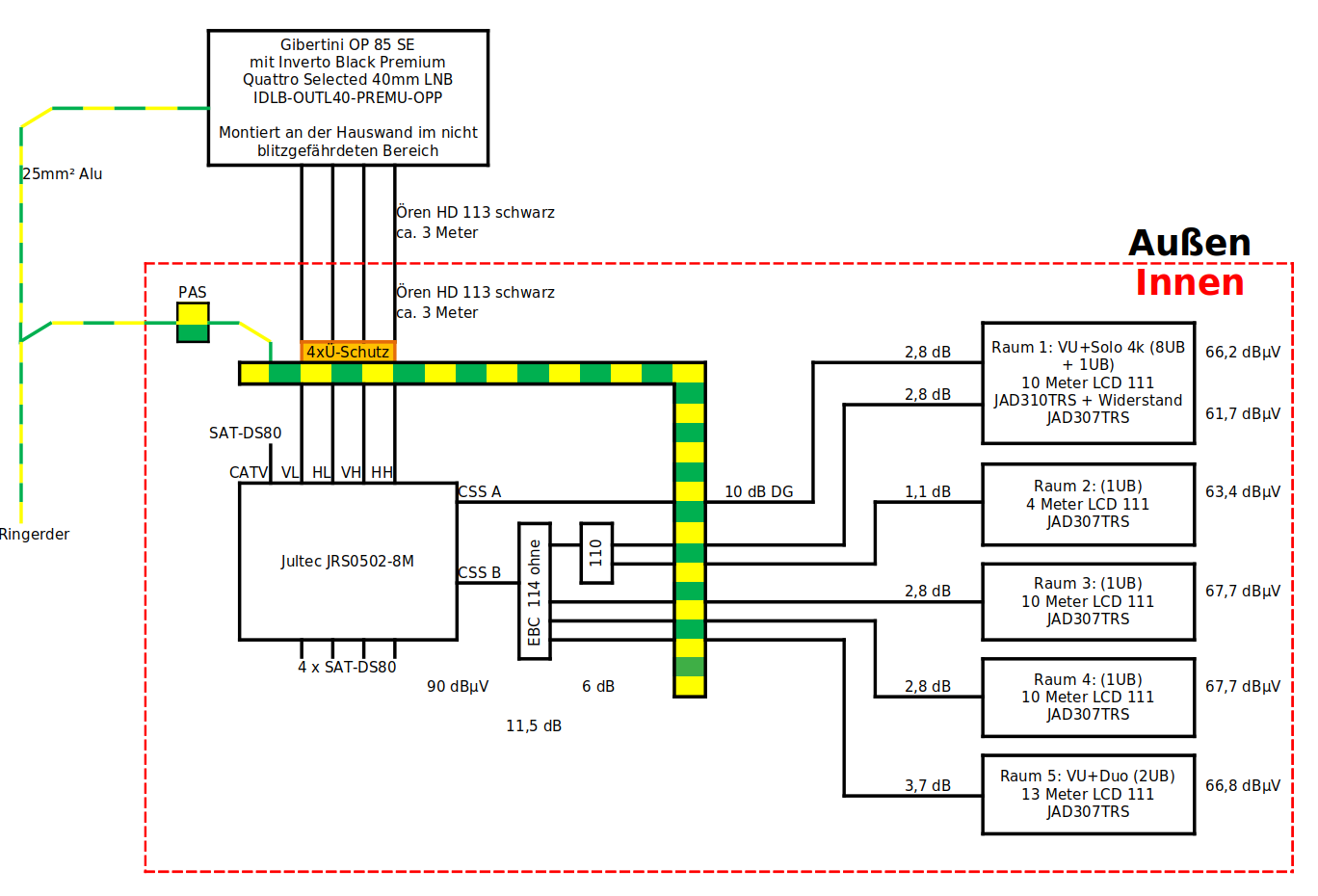 Das passt alles sehr gut, selbst wenn jetzt der EBC110 noch raus kommen würde wären wir laut ihrer Berechnung im Raum 2 unter 70dbµV.Latz hat geschrieben: 14. Januar 2021 09:22Mich würde interessieren ob meine Pegelberechnung soweit korrekt ist, oder ob ich noch irgendetwas wichtiges vergessen habe.
