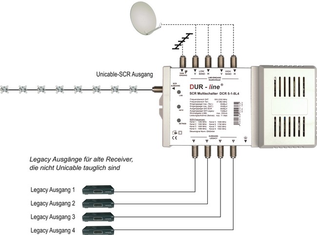 - 1x Unicable Multischalter wie gewünscht (in ihrem Fall der Dur-Line DCR 5-2-4L4)