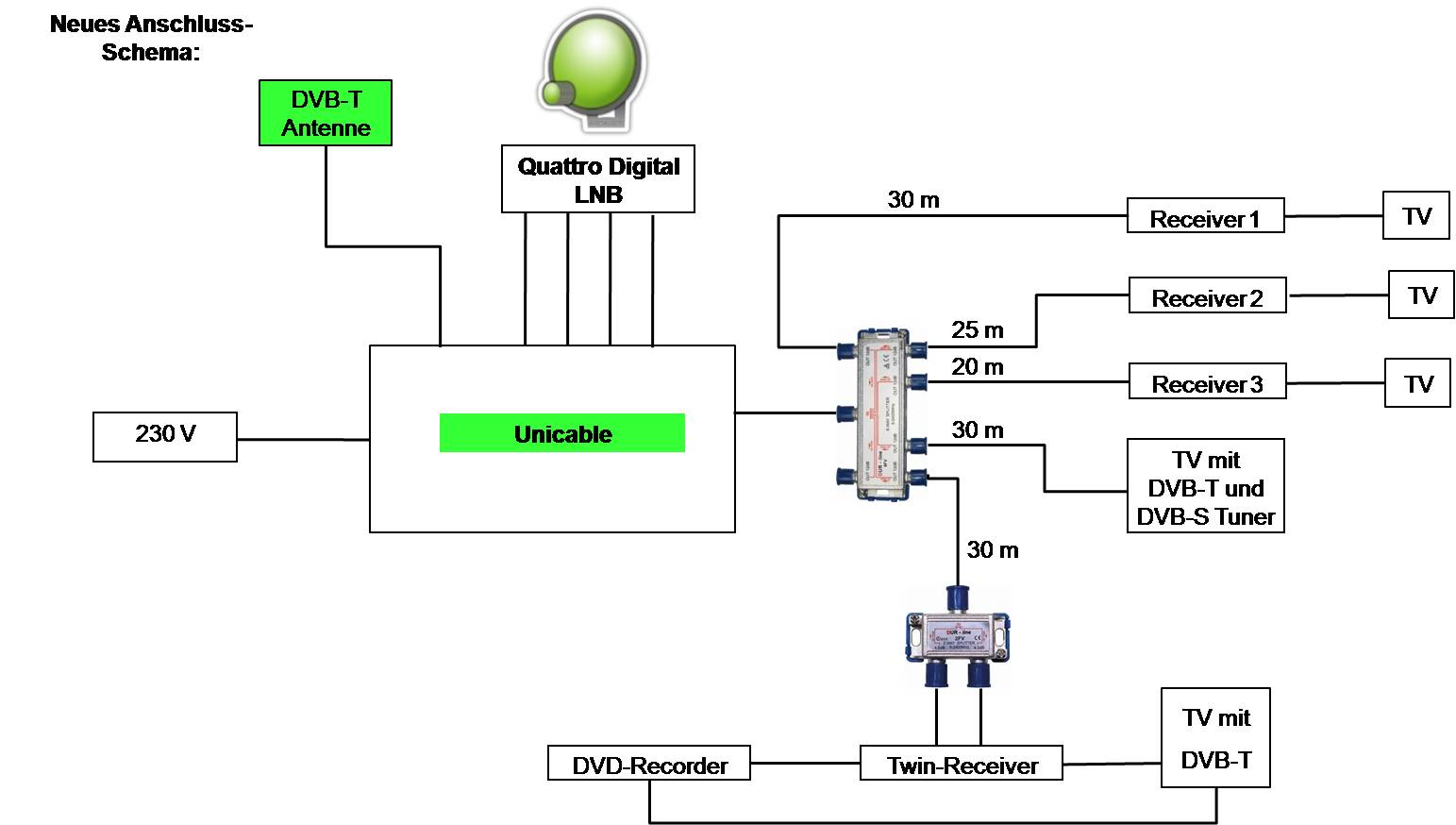 Ich habe die bisherige Lösung und die neue Lösung, so wie ich sie mir vorstelle als Bilder angefügt. Die bisherige Sternverteilung kann ich nicht ändern. Auch kann ich kein zweites Coax-Kabel für den Twin-Receiver legen.