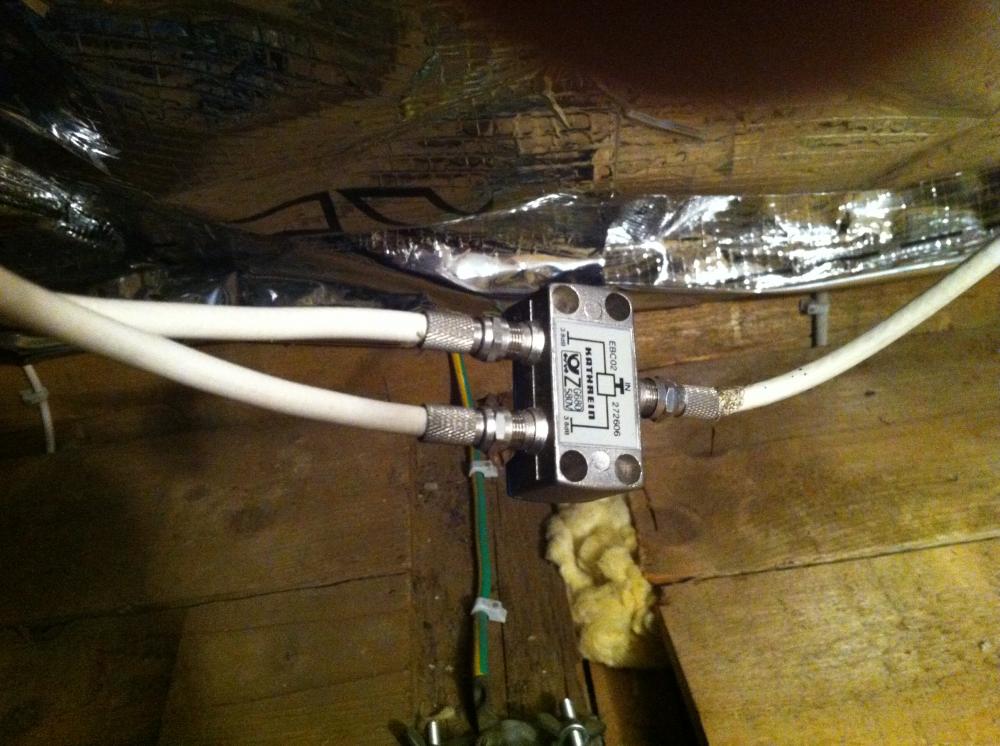 Dies sind alles Durchgangsdosen bzw. im Keller eine Enddose, die zweite Enddose habe ich noch nicht gefunden. Hier kommt ja nur ein Unicable System in Frage obwohl ich persönlich sogar lieber eine richtige Sternverkabelung bevorzugen würde bzgl. der Recevier Unterstützung, aber der bauliche Aufwand wäre zu hoch. Ich habe bereits intensiv gesucht ob ich auf dem verwendeten Kabel irgendeine Hersteller- oder Typenbezeichnung finde, leider Fehlanzeige das Kabel hat nur einen weißen Außenmantel. Wie kann ich feststellen ob das Kabel wirklich für ein UNICABLE System geeignet ist? Im Wohnzimmer des EG sollte eine TWIN Receiver Möglichkeit sein, ansonsten nicht. Eine 8 Teilnehmer Anlage würde aus meiner Sicht voll ausreichen. Welche Komponenten können Sie uns empfehlen? Was müsste ich noch sonst noch beachten? Die Satschüssel sollte auf dem Dach installiert werden. Die Info´s wegen Blitzschutz werde ich mir noch zu Gemüte führen. Eine Potentialausgleichsschiene ist natürlich im Keller vorhanden, auf dem Dachboden wo die Kabelstränge verteilt sind ist auch eine Art Erdungsschiene und ein Erdungskabel vorhanden anbei mal die Bilder vom Dachboden.