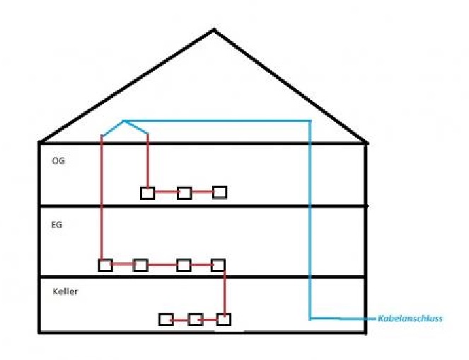 benni-it hat geschrieben:Was ich bisher nachvollziehen konnte ist folgendes: vom Keller aus geht ein Kabel auf den Dachboden von dort aus gehen 2 Stränge wieder nach unten und verteilen das Haus wie folgt: