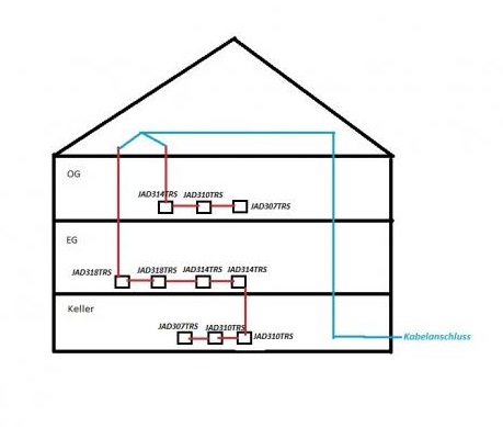erstmal vielen Dank für diese sehr informative Platform. Meine bessere Hälfte hat ein Haus geerbt und dort ist überall normales Kabel verlegt. Das Haus ist ein Fertighaus und es wurde 1987 erbaut wir möchten diese gerne komplett auf SAT umrüsten und alle benötigten Komponenten natürlich über Sie beziehen. Wichtig ist uns das die Komponenten eine hohe Qualität haben, damit es nachher keine Schwierigkeiten in den kommenden Jahren gibt. Ich habe mich bereits durch die gesamte Bau-Dokumentation mehrmals gearbeitet kann aber zu dem Thema Antennenverkabelung keine Informationen finden, auch keinerlei Rechnungen vom Elektriker. Was ich bisher nachvollziehen konnte ist folgendes: vom Keller aus geht ein Kabel auf den Dachboden von dort aus gehen 2 Stränge wieder nach unten und verteilen das Haus wie folgt: