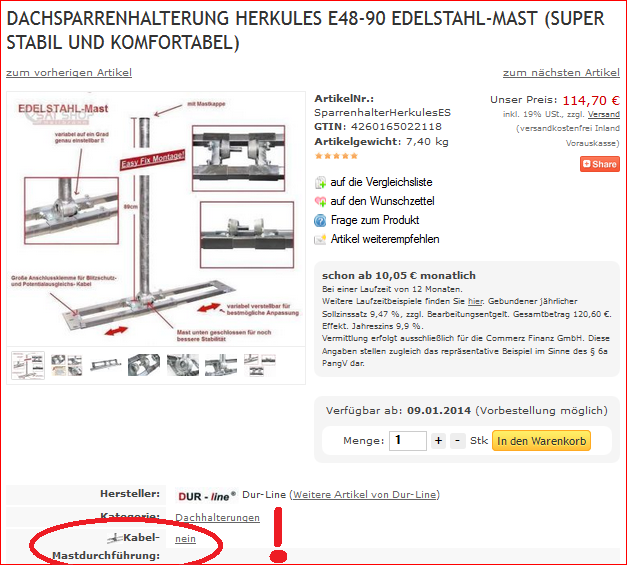 benni-it hat geschrieben:Falls, ja wäre es am einfachsten wenn ich Ihnen die Mastkappe mit Kabeldurchführung und die Aludachpfanne (sind ja wahrscheinlich beide bereits auf dem Weg) wieder zurücksende und Sie mir die Alu-Dachpfanne mit Kabeldurchführung zu senden.