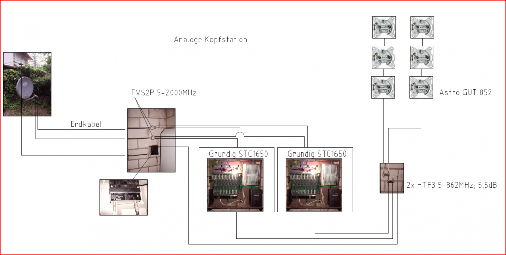 Zur Zeit haben wir eine analoge Satellitenanlage mit Kopfstation Grundig STC 1650, 24 Programme und die Kabelverteilung erfolgt in zwei Strängen in Baumstruktur zu den Wohneinheiten. Es sind zwei analoge Kopfstationen mit jeweils 12 selektiv aufbereiteten Kanälen, wodurch eine Nutzung der Programme ohne Receiver in den Wohnungen möglich ist.