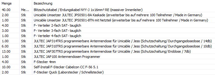 Das wären dann 2x Jultec JPS0501-8A + 1x Jultec JPS0501-8TN ..... kaskadiert hintereinander geschalten. Hatten wir gerade in einem anderen Beitrag z.B. unter Bestehende SAT-Anlage um Unicable erweitern wo das erklärt wird.myoo hat geschrieben:- Multischalter/Kaskaden sollten (möglichst) stromsparend Receiver-Powered sein (VDU 518 o.ä.)