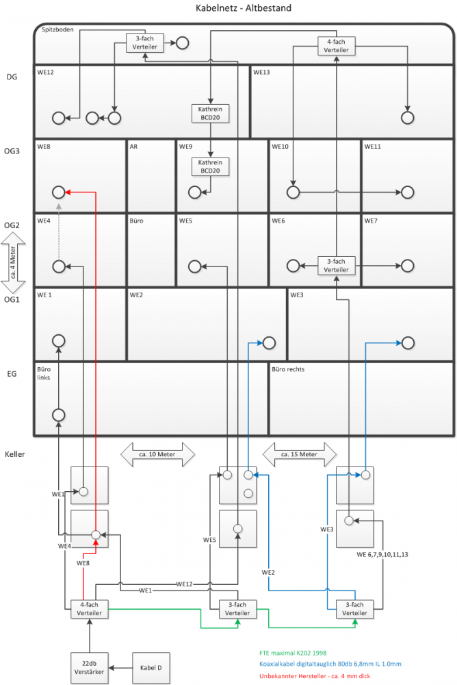 Wir möchten (primär aus Kostengründen) unsere bestehende Kabelfernsehlösung auf Satellit umrüsten. Hier geht es um einen 4 geschossigen Altbau inmitten in einer Stadt mit 13 Wohneinheiten. Das Gebäude besitzt keinen Blitzschutz. Die ältesten Leitungen aus dem bestehenden Kabelnetz stammen ungefähr aus dem Jahr 1992. Es gibt überall die (alten) 2-Loch Dosen. In den Leitungswegen befinden sich derzeit mehrere einfache Leitungsverteiler (2-fach und 3-fach). Über die Jahre wurden verschiedene Etagen immer mal wieder um- und ausgebaut - daher ist die aktuelle Kabelführung vielleicht ein wenig sonderbar.