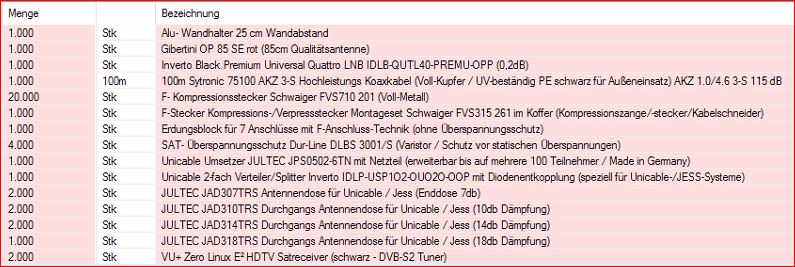 Hier ein Screenshot der Bestellung Als einziges ist mir da aktuell aufgefallen das sie 100m von dem Sytronic-Koaxkabel (UV-beständig für den Außenbereich) bestellt haben und dazu Kompressionsstecker + Montagewerkzeug. Spricht absolut nichts dagegen, ist aber bei diesem Kabel auf Grund des Durchmessers vom Dielektrikum und durch die Gegebenheit das seine äußerste Abschirmung/Folie/Hülle verklebt ist gerade bei diesem Kabel am schwersten diese zu montieren ! Ich empfehle das Kabel vorher mit einem Heißluftfön etc. zu erwärmen, dann geht es eigentlich recht einfach. Ohne dies holt man sich aber sehr schnell Blasen an die Finger (ich zieh da sogar immer Handschuhe dabei an).Det4711 hat geschrieben:Bei allen ihren Hinweisen habe ich kein k.o. Kriterium gesehen. Daraufhin habe ich soeben den Warenkorb für mich zusammengestellt und bestellt.