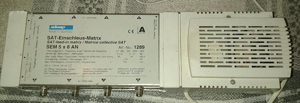 Das LNB ist ein Hirschmann HIT CS 404 Quad-LNB (die nennen das "Quatro-Switch"). Vom Bereich der Antenne führen ich glaube 7 Satkabel ab (die exakte Zahl ist nicht so wichtig, weil ich nur drei bzw. in der Idee nur zwei brauche), zwei davon ins führen Wohnzimmer. Irgendwann ist ein Multischalter dazu gekommen (ANKARO SEM 5 x 8 AN). Damit wurde damals ein HUMAX ICORD im Wohnzimmer versorgt, außerdem ein Medion-Fernseher mit eingebautem Receiver in einem anderen Raum.