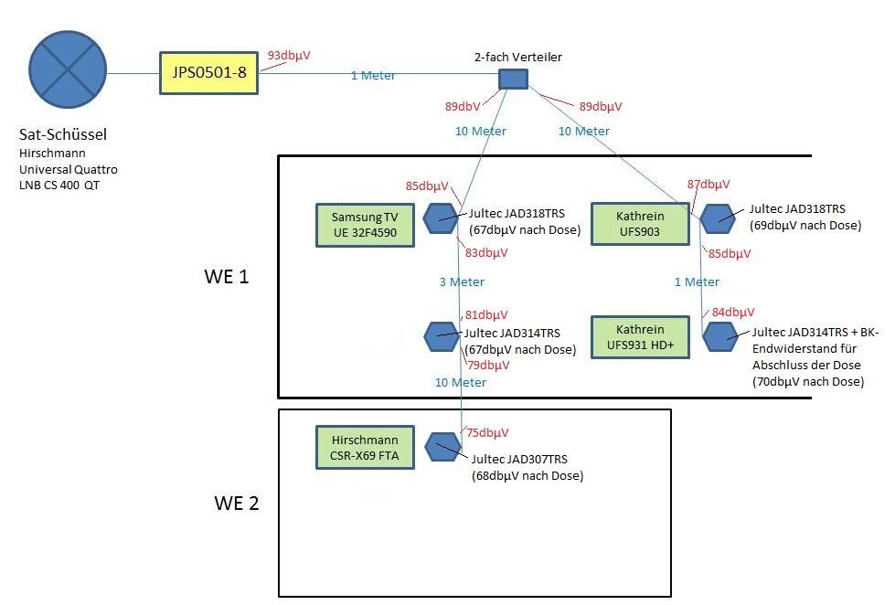 Linker Strang: Jultec JAD314TRS (Unicable-Durchgangsdose diodenentkoppelt / 14db Auskoppeldämpfung) => Jultec JAD310TRS (Unicable-Durchgangsdose diodenentkoppelt / 10db Auskoppeldämpfung) => Jultec JAD307TRS (das ist eine wahre Enddose)