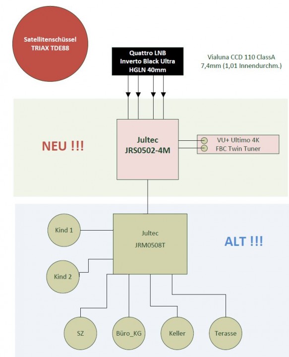 Ich habe zur Zeit einen Multiswitch von Jultec (JRM0508T) im Einsatz. Über diesen versorge ich 8 Sat-Anschlüsse die Sternförmig im Haus angeordnet sind. Ich möchte nun die beiden Kabel, die ins Wohnzimmer zu meiner noch nicht erworbenen Ultimo 4K (mit FBC Tuner) gehen JESS -fähig machen.