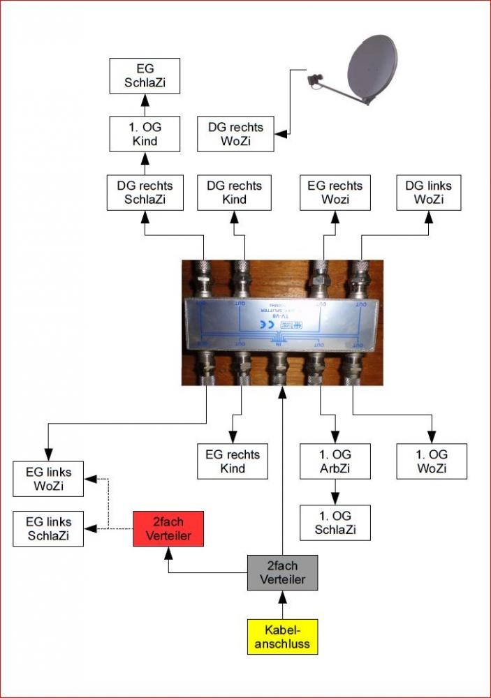 Der Verteiler wäre ein normaler SAT 2-fach Verteiler (weil dahinter dann diodenentkoppelte Antennendosen zum Einsatz kommen).