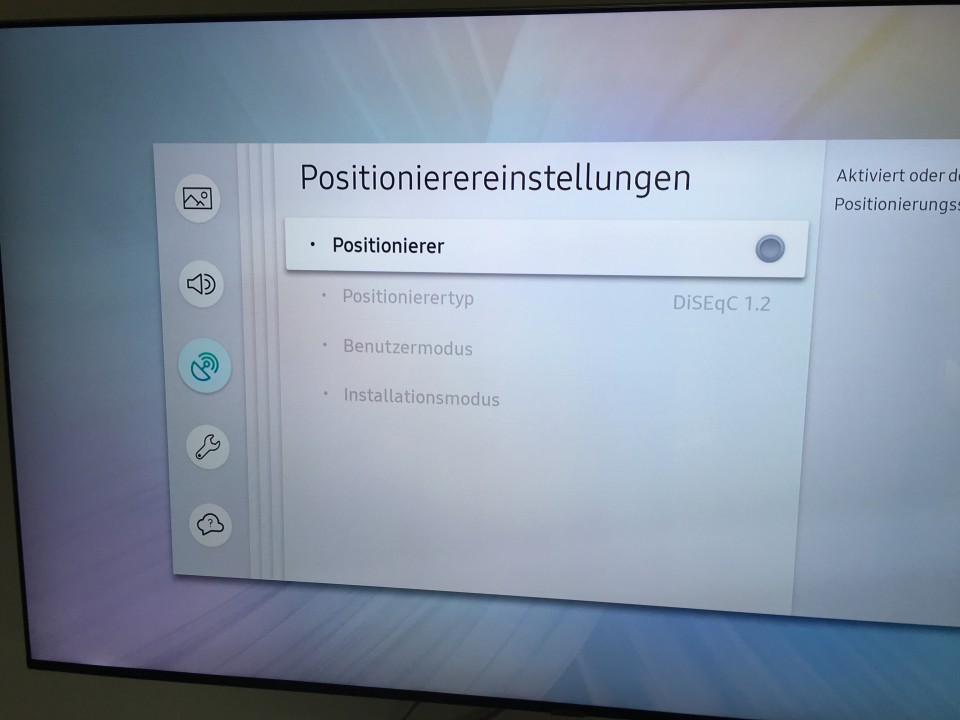 Der Positionierer bleibt auf aus. Dieser ist nur für motorisierte Drehantennen. Sobald du ein Programm auswählst, dreht dieser dann den Spiegel auf den zugehörigen Satelliten.