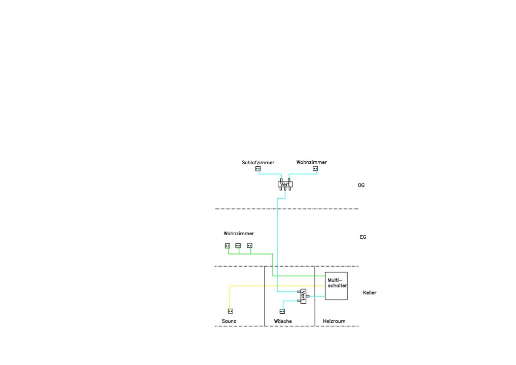 - blauer Strang wird im Keller aufgeteilt, ein Kabel geht in den Arbeitsraum (Wäsche etc.), das zweite ins Obergeschoss zu einem weiteren Verteiler für Wohn- bzw. Schlafzimmer.